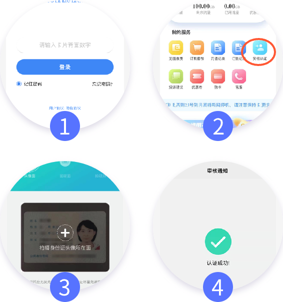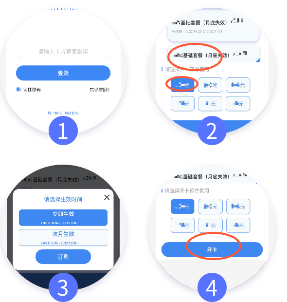 输入卡号点击登陆——选择套餐、充值金额——选择生效时间——点击开卡